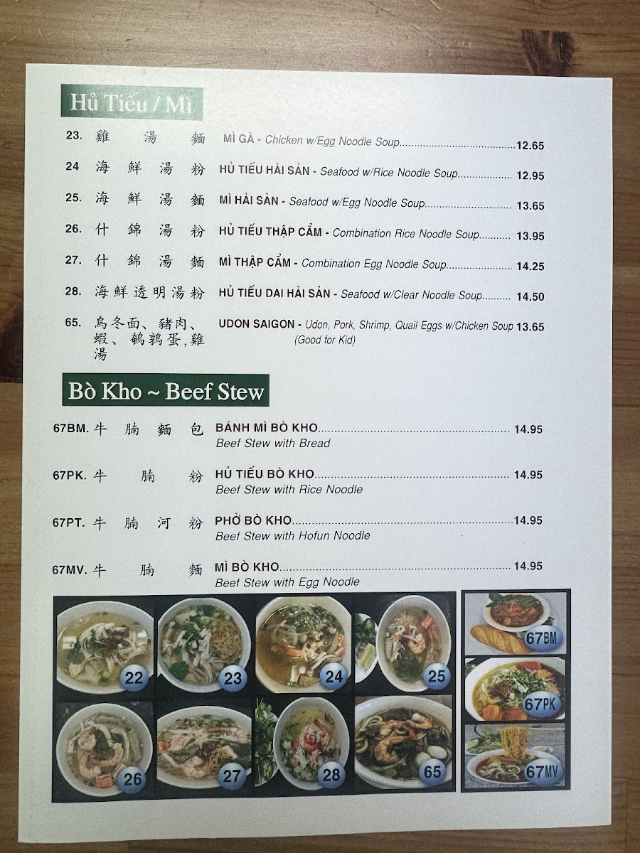 The restaurant also serves a range of delicious Beef Stew dishes, such as the Bánh Mì Bò Kho (Beef Stew with Bread) and Hủ Tiếu Bò Kho (Beef Stew with Rice Noodle). If you're in the mood for something spicier, the Phở Bò Kho (Beef Stew with Hofun Noodle) and Mì Bò Kho (Beef Stew with Egg Noodle) deliver the perfect balance of heat and flavor. Additionally, the Bún Bò Huế (Hot & Spicy Beef Noodle Soup w/Thick Rice Vermicelli) is a must-try for fans of bold, spicy flavors.